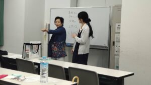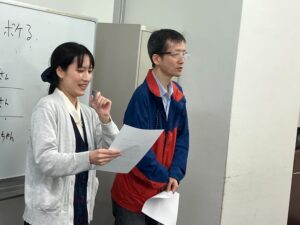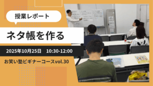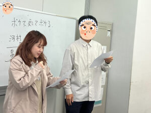 今回の授業では、サンドウィッチマンの代表的な漫才コントであるヒーローインタビューを題材に、会話型コントに必要な要素を学びました。